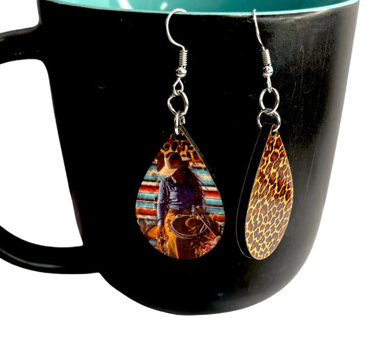 Western Rodeo Cowgirl on horse Leopard Print Dangle Teardrop Handmade Earrings